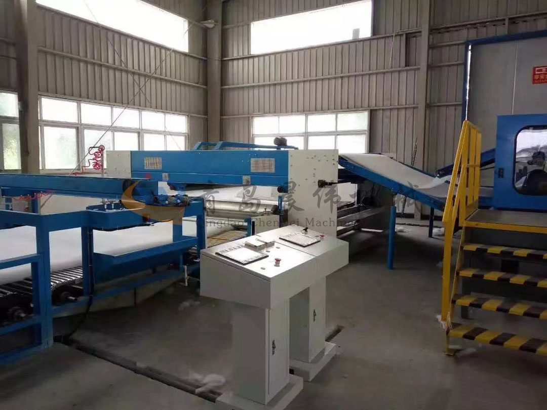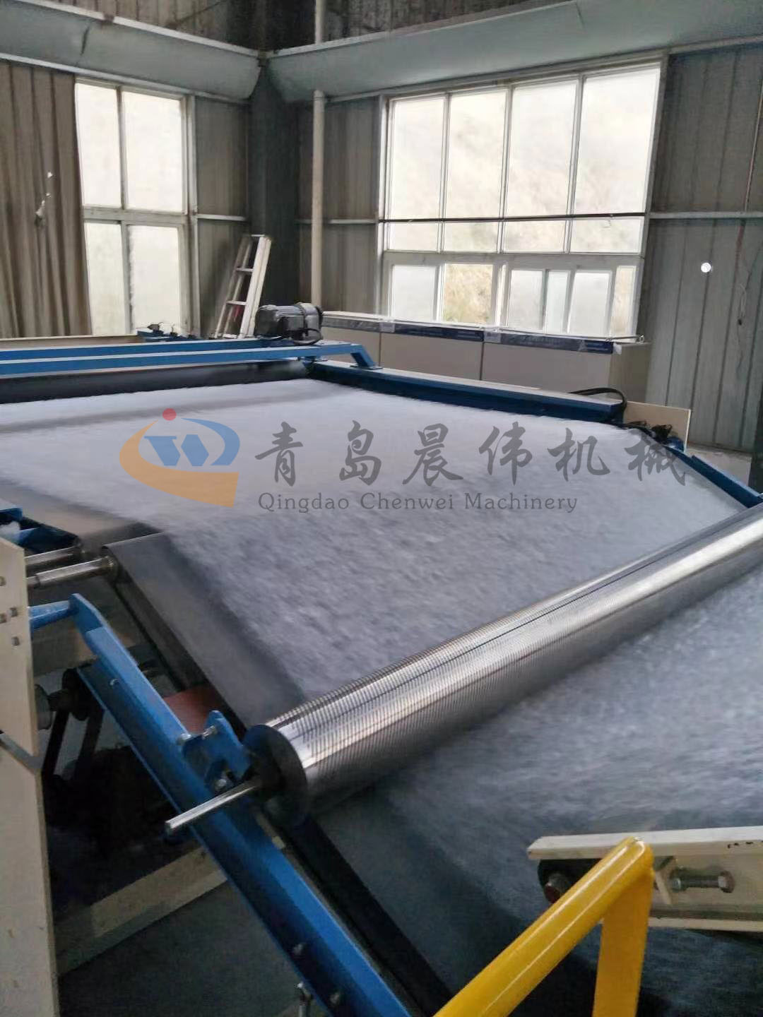 5. CWPW-鋪網機:用于將梳理纖網通過移動小車交叉折疊為所需幅寬和定量的多層纖網,以供后道工序使用。鋪網輥采用特殊結構,加裝壓網輥和導流板,不飄網不起皺,五只大功率電機精確控制各部件的運動,電動輸出簾高度調節裝置