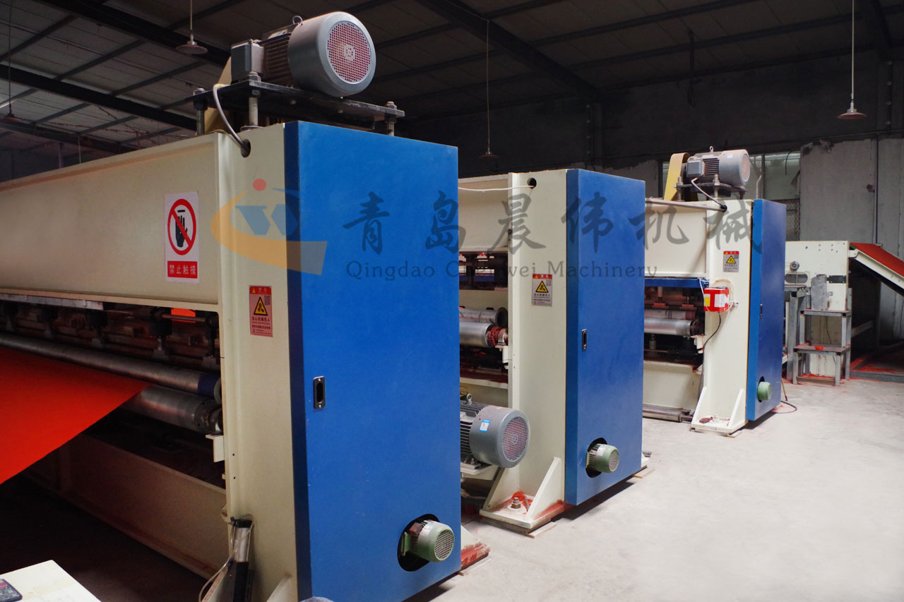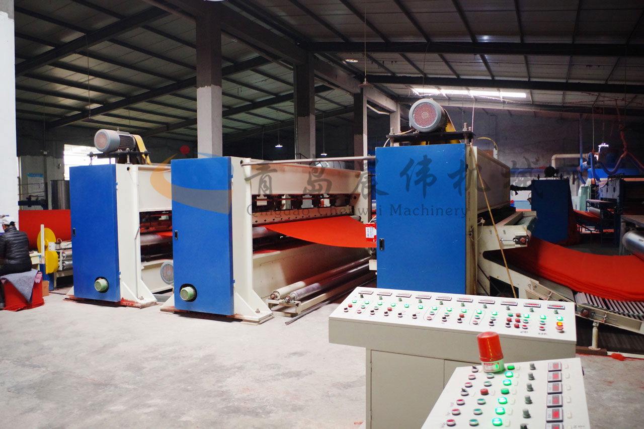 5. CWPW-鋪網機:用于將梳理纖網通過移動小車交叉折疊為所需幅寬和定量的多層纖網,以供后道工序使用。鋪網輥采用特殊結構,加裝壓網輥和導流板,不飄網不起皺,五只大功率電機精確控制各部件的運動,電動輸出簾高度調節裝置