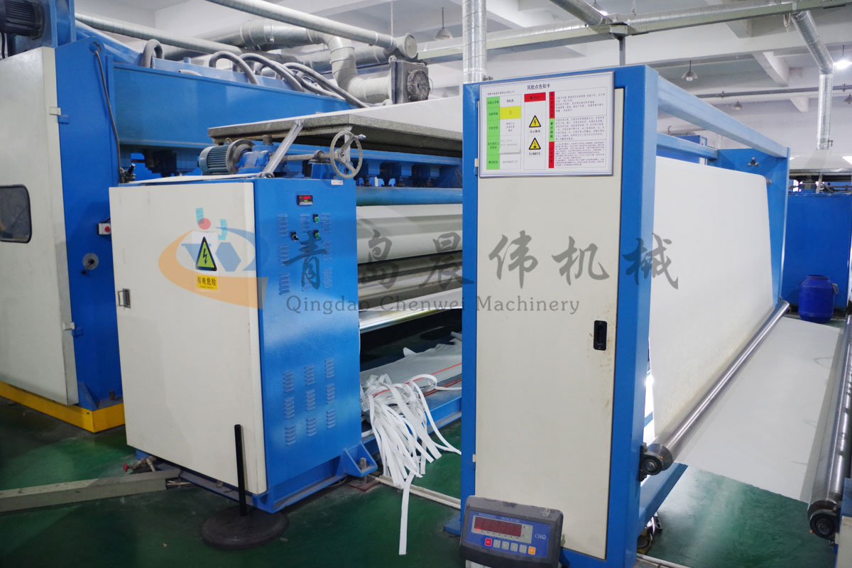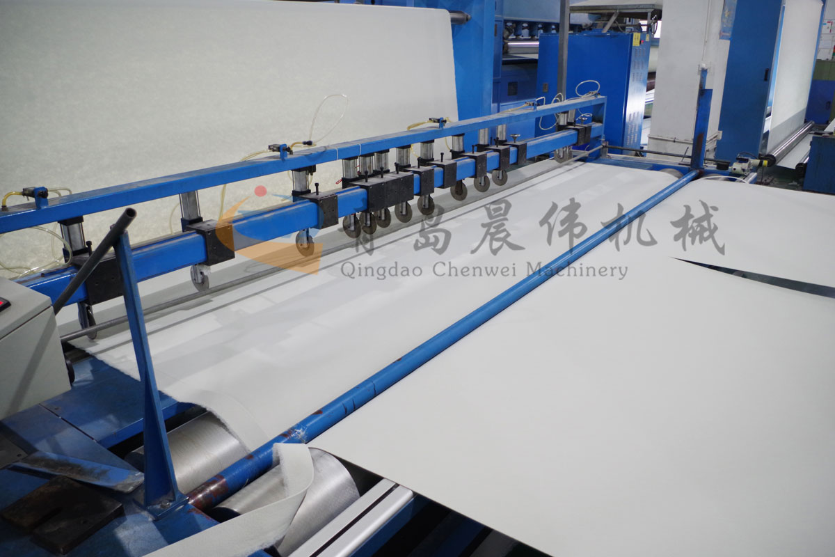 5. CWPW-鋪網機:用于將梳理纖網通過移動小車交叉折疊為所需幅寬和定量的多層纖網,以供后道工序使用。鋪網輥采用特殊結構,加裝壓網輥和導流板,不飄網不起皺,五只大功率電機精確控制各部件的運動,電動輸出簾高度調節裝置