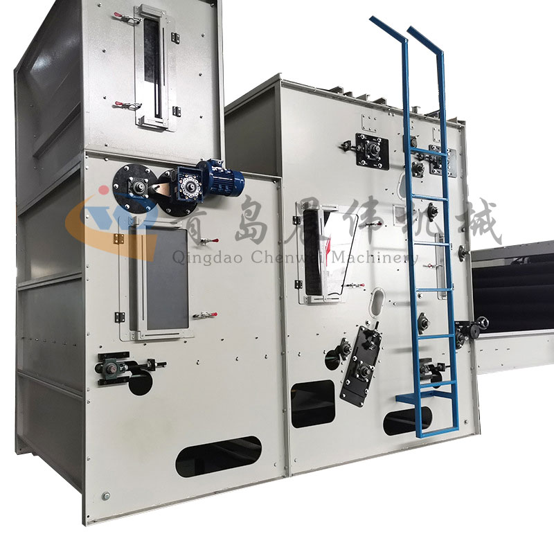 震動式給棉機主要式將經過初步開松的纖維集中收集在棉倉中,并且鋪成相對均勻,等厚,等寬的纖維棉層輸送到梳理機。